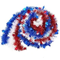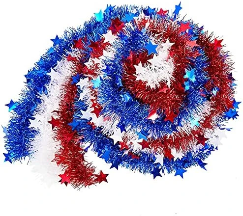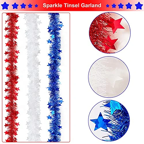 - Perfect Touch for Patriotic Decor: Metallic tinsel garlands contains classic elements of 4th of July, which make your room or yard full of patriotic atmosphere. They are good as part of summer decoration for the home. You will also keep an excited memory by taking photos with these sparkle American colors tinsel garlands as photo props.