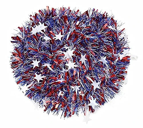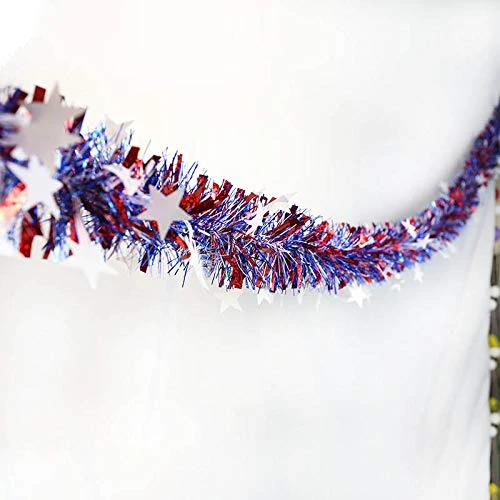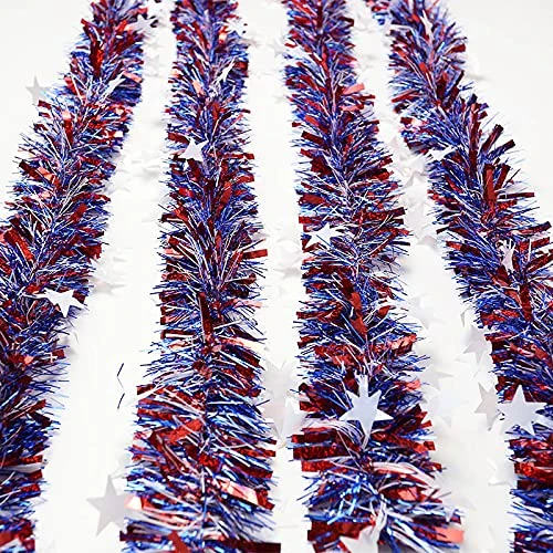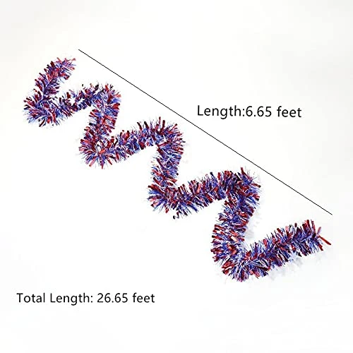 - 4PACK Forth july Tinsel Garland, each pack approximately 6.5 ft in length x 3.5 inch in width, totally 26.6 ft. Not scratchy in any way. Soft and classic tinsel garland, sparkle for Festivals.