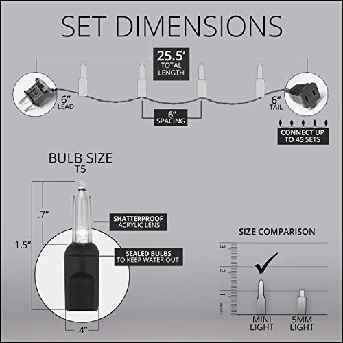 - [ CLASSIC ACRYLIC LENS ]Â The T5 bulb gives you the traditional Christmas light look that you love, but with all the advantages of LED. Patented one-piece NON-REMOVABLE bulb/base construction seals out moisture, eliminating corrosion for longer bulb life.