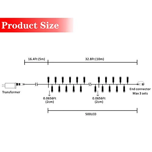 - High Quality: 500 LED 49ft Christmas cluster lights with solid construction plastic material, adapter powered. 29V low voltage string lights with UL 588 certified for safety use. Length between lights : 0.8 Inches, power line: 16.4ft. light string: 32.8ft, length totally: 49ft approx.