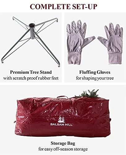 - COMPLETE SET-UP: Includes premium tree stand with scratch-proof rubber feet, off-season storage bag(s), and cotton gloves for fluffing.