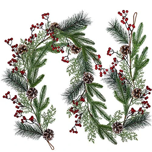 - Color: Blooming with festive style, this Christmas garland features a beautiful blend of realistic green pine needles, spruce branches, cypress branches, red berry clusters and frosted pinecones, full of holiday colors and Christmas charm!