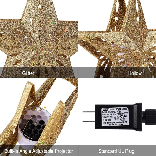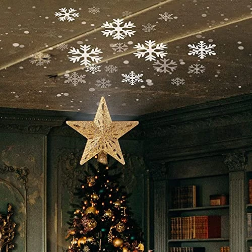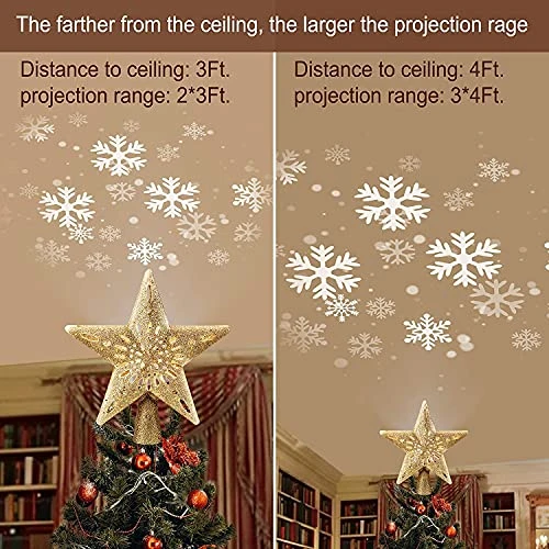 - Led projector: Multifunctional projector star topper, built-in a 4 LED with auto-moving motor, projecting an animated snowing effect of dynamic dancing snowflake and snowy spots patterns, a vivid snowy picture indeed. The upward shooting area reaches 21-53 sq.Ft., sufficient for a common room or living room decorating