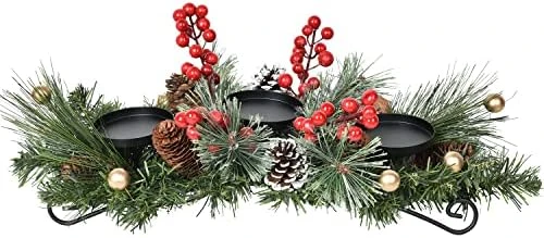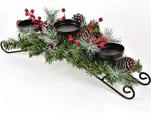 - 【Festival Candle Holder】– This centerpiece features three steel plates each hold a single pillar style candle, and large pine cones, holly berry picks and green crafted branches.