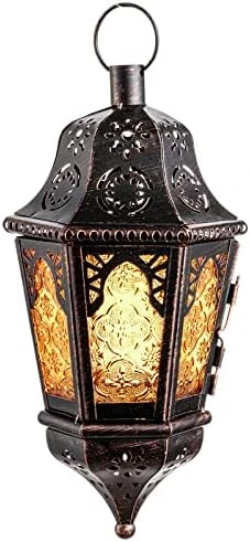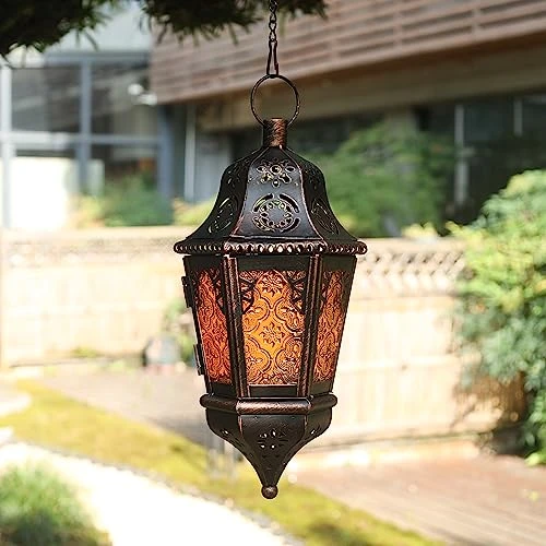 - CONSUMMATE WORKMANSHIP – Inspired by Moroccan hookah lounges and Turkish bazaars, this alluring amber glass hanging lantern lends a touch of worldly flair to your aesthetic. Made from iron in a bronze finish, this exotic design strikes a hexagonal prism silhouette with intricate cutouts and a decorative ball finial. Just add a tealight candle or flameless LED and this piece radiates light through textured amber glass for a calming glow.