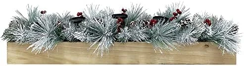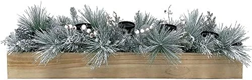 - DESIGNER FINISHES: Five pillar plates in a rustic wood box overflowing with frosted faux pine boughs, white berries, and pinecones that will add elegance and warmth to your home. Recommended for pillar candles up to 3 inches tall (not included).