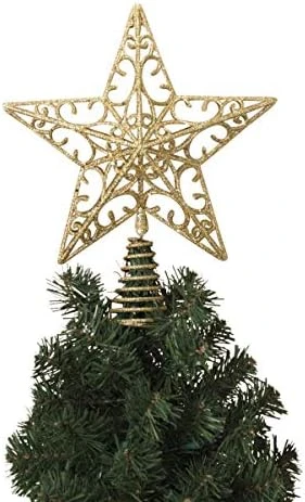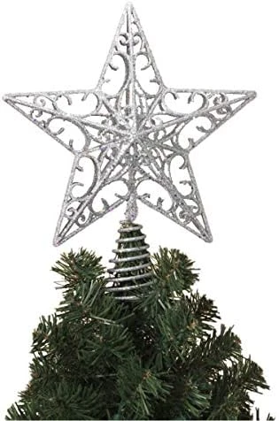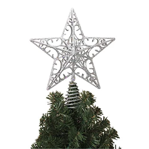 - Features a glittery silver-colored star with a hollow, dimensional design, allowing light to shine through and reflect on all sides