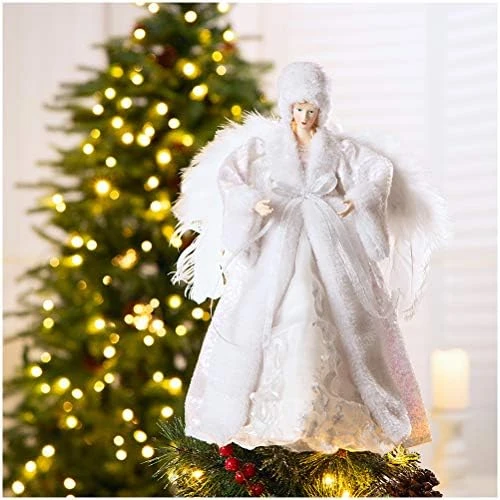 - The angel treetop has fur on her hat and fur on the trim of her red black plaid coat, her back has a pair of beautiful white feather wings.