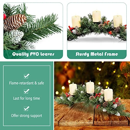 - Quality Material – Made of quality PVC material, the leaves are flame-retardant, greatly improving safety. The metal base is sturdy and firmly holds the Christmas triple candelabrum. In addition, materials are durable and fade-resistant, allowing the centerpiece table decoration to keep fresh for long time.