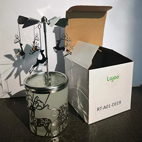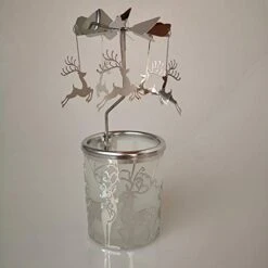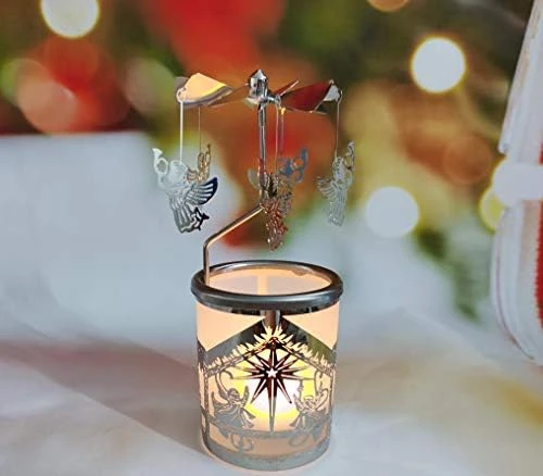 - Carousel Spinning Rotary Candleholder with laser-cut silver reindeer patterns, Angel , Elk, Snowflake and Christmas Tree design .Rounded corners without burrs, Metal double-sided multiple silver plating. shiny surface will not fade for a long-term use.