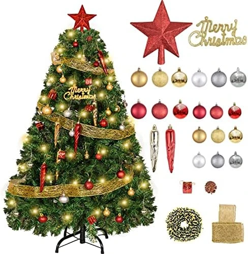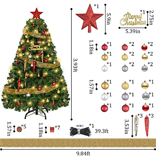 - 【Extra Christmas Tree Decorations】:This Christmas Tree includes (1) Christmas Tree,(1) USB String Lights (15) Christmas Baubles [1.1″], (9) Christmas Baubles[1.6″], (6)Christmas Tree Cone[3.5″], (7) Gift Box[1.1″], (5) Artificial Pinecone, (1)Christmas Tree Topper Star[5.9″], (1)Christmas Tree Ribbon[9.8 Ft], (1) Merry Christmas Sign,(1)Metal Stand, (1)Installation Guide
