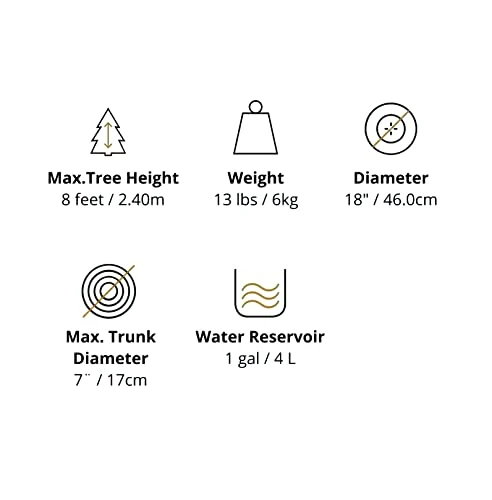 - 18″ (46cm) diameter extra-large tree stand, base weight app. 13 lbs. (5.9kg).