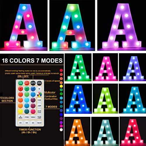 - FUNCTIONA REMOTE CONTROL:Point the 32 keys remote Control to the Letter, turn on the lights, choose your favorite colors, speed, modes (FADE, JUMP, ASYN FADE, ASYN JUMP, TWINKLE, STROBE, IN WAVES) for birthday, Christmas celebration, Halloween or wedding party.
