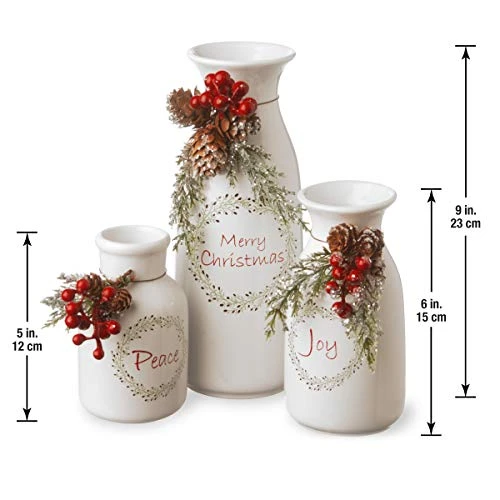 - UNIQUE HOLIDAY DECOR: Built to endure many holidays with its sturdy material. It has an opaque white color each with a Christmas holiday motif and sentiment painted on it. All three bottles are tied at the neck with a sparkled evergreen branch trimmed with pinecones and berries.