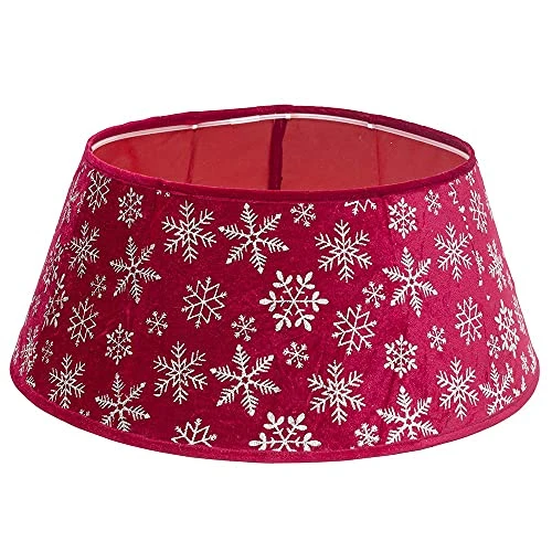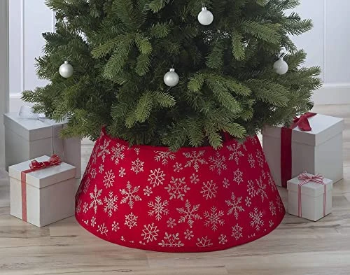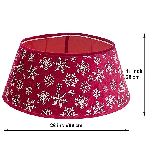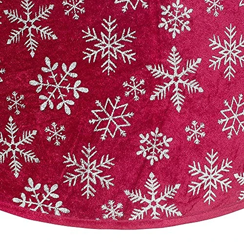 - Christmas tree collar is made from classic red velvet material, decorated with glittery silver snowflakes, and trimmed with solid red velvet edging