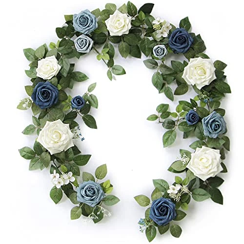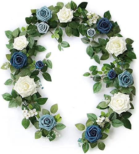 - Dusty Blue and Navy Flowers Garland Details: The blue flower garland including 4”large roses x3, 3”regular roses x8, 2”smaller roses x1, 1.5”smallest rose x3, white small silk flowers, blue plastic florets and full of greenery leaves.