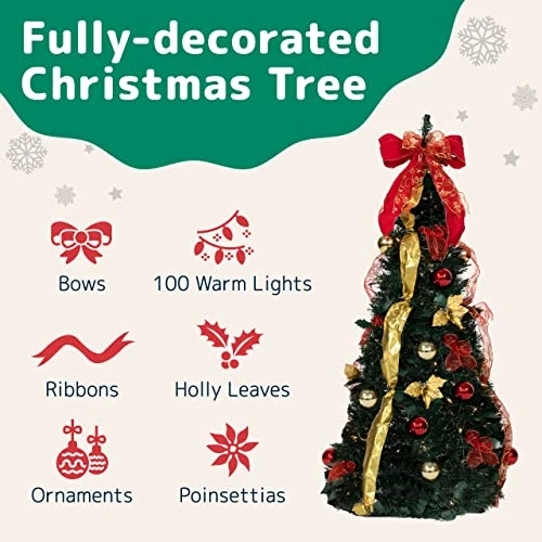 - ELEGANTLY PRE-DECORATED – Each tree comes redecorated with a showstopping bow topper, opulent ribbons, shatterproof ornaments, 100 warm lights, fluffable pine inspired foliage and so much more.
