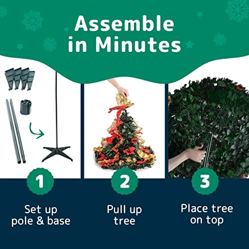 - EASY ASSEMBLY & STORAGE – Our tree can be assembled in seconds. Simply arrange the stand, place the tree atop it, drape to your taste and plug in. Holiday cheer in a snap.