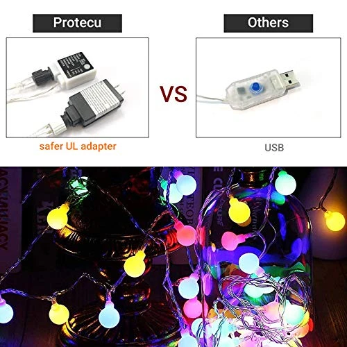 - INDOOR & OUTDOOR APPLICATIONS: Protecu bulb string lights could be widely used for indoor and outdoor Christmas tree garden decorations. Ideal for bedroom, living room, balcony, dorm, deck, backyard, patio, front porch or for illuminating trees, shrubs, crafts. The small ball string lights will add a fun, festive ambiance, especially for birthday, wedding, party, Christmas and New Year. Also perfect gifts for family, guests and friends