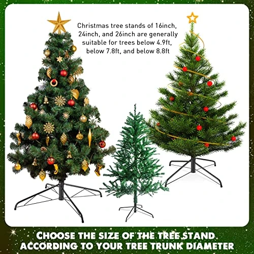 - Wide Range of Use: Christmas tree stands of 16 inch, 24 inch, and 26 inch are generally suitable for Christmas trees below 4.9ft, below 7.8ft, and below 8.8ft, which can be applied for winter parties, Christmas home decorations, to bring a strong holiday atmosphere to your home