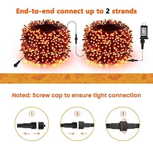 - End-to-End Connectable & Easy to Install: Each orange Halloween lights feature a male and a female safe plug, an easy end-to-end connection allows up to 2 strands (262ft in total) connected together to illuminate a wider range. Just hang the string light on wherever you like, power on and press the button on the adapter, you will get a charming night with these orange lights!