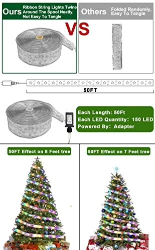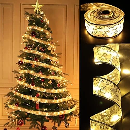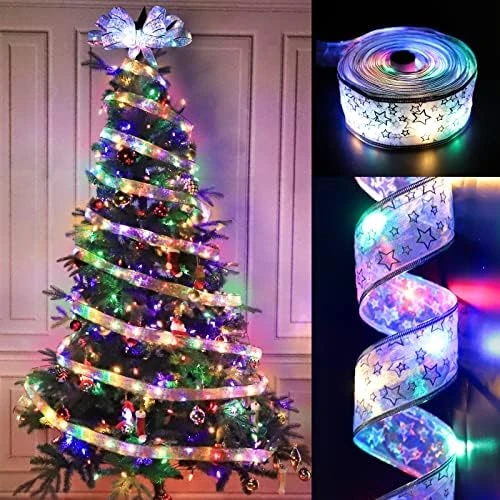- [ Durable Materials ] The ribbon Christmas lights is made of gauze material, durable and not easy to tear. When the light passes through the gauze, it will emit a beautiful light and creat a warm atmosphere for your Xmas tree.