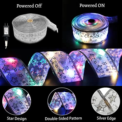 - [ Double-sided Star Pattern Design ] Featuring with Double-sided silver/golden star pattern design. 2 Lighting colors are available: cool white/warm white. There are built-in iron wire at the both ends of ribbon Christmas lights, so you can bend it into any shapes, such as bow,etc. And it will keep that shape a long time.