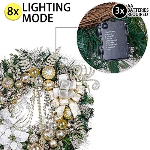 - 【Battery Operated LED Light】 – This wreath with lights is 6 hours on, 18 hours off, auto-cycle daily, dimmable with 8 light effect. 3 AA batteries required (not included)