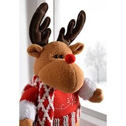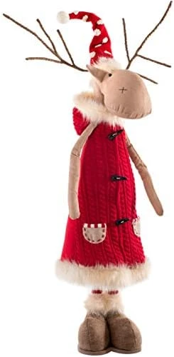 - He has a Red Christmas hat with Cream decoration and Fur trim, Brown boots with a Fur trim and twig like antlers